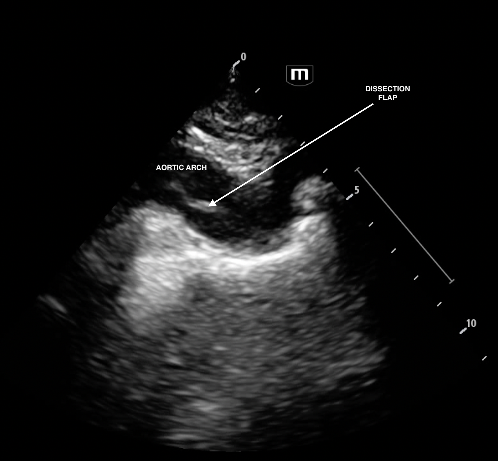 Still of the suprasternal cine loop from above with arrow pointing to dissection flap.