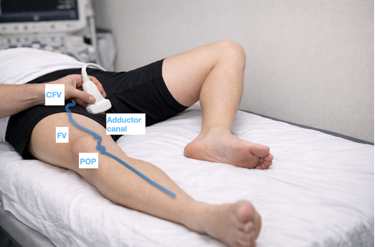 The femoral vein travels medially down the leg and passes under the sartorius muscle at the adductor canal. Mostly it can be compressed with downward pressure. At the adductor canal, have the probe facing the medial femur and compress the vein against the femer by putting lateral pressure. At this point, you may need to help with medial pressure from your hand against the patient's lateral leg.