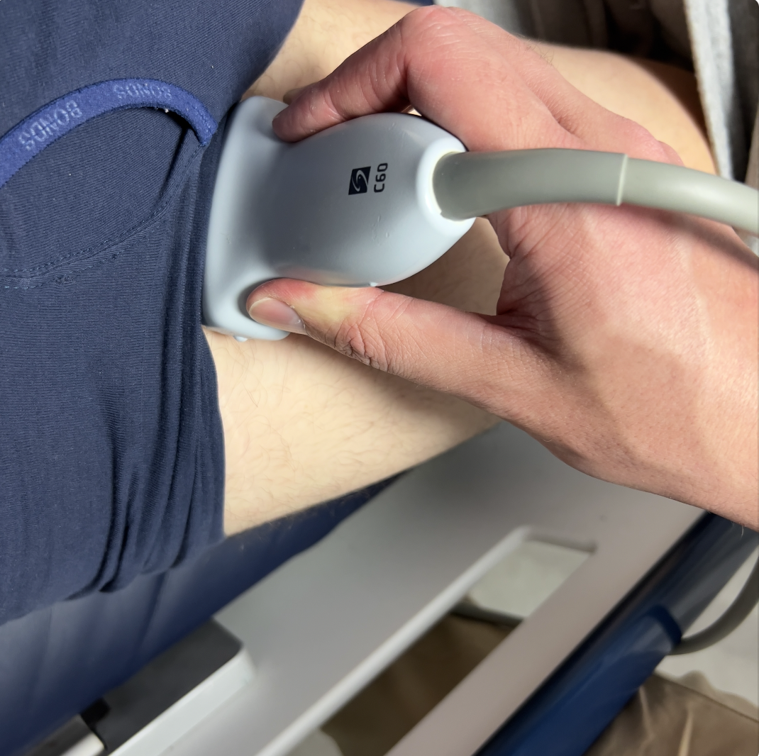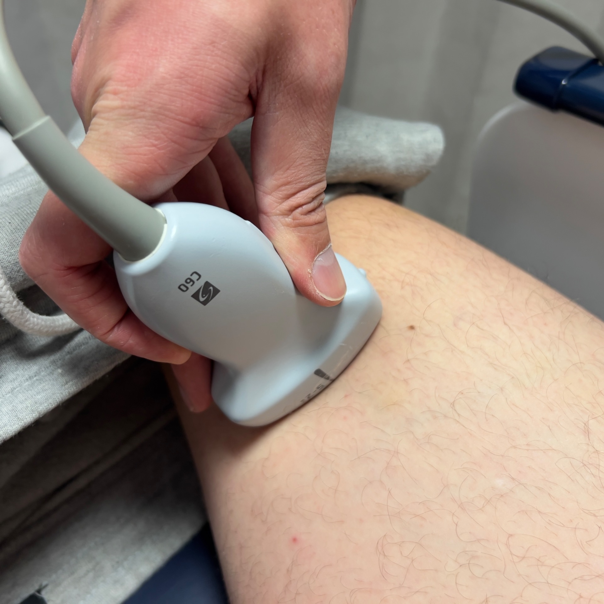 To assess the vein: apply a strip of gel on the medial thigh from the inguinal canal to the knee. Hold your probe in transverse with the probe marker to the patient's right. Hold the probe as close to the face of the probe as possible and stabilise your palm on the patient's leg.