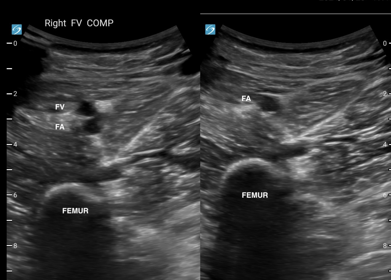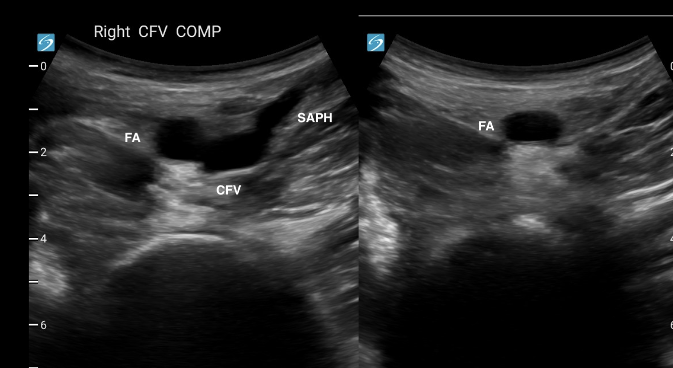 The image on the right only shows the FA, because the CFV and saphenous vein have been compressed.