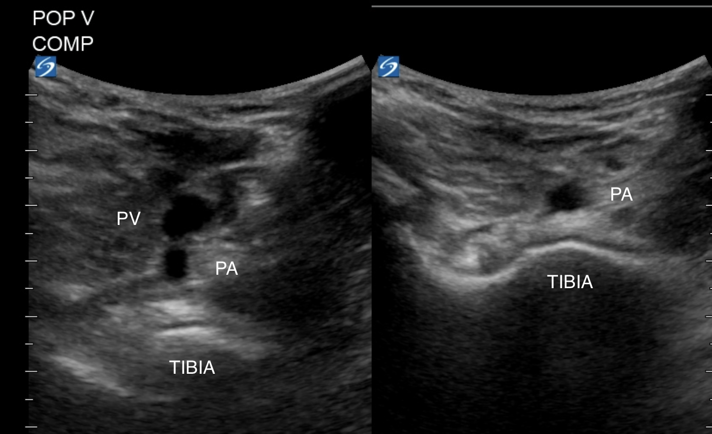 On the screen you will see the vein superficial to the popliteal artery and the tibia. Compress with upward pressure against the tibia. Fan cranially and caudally to image as much of the popliteal vein as possible.