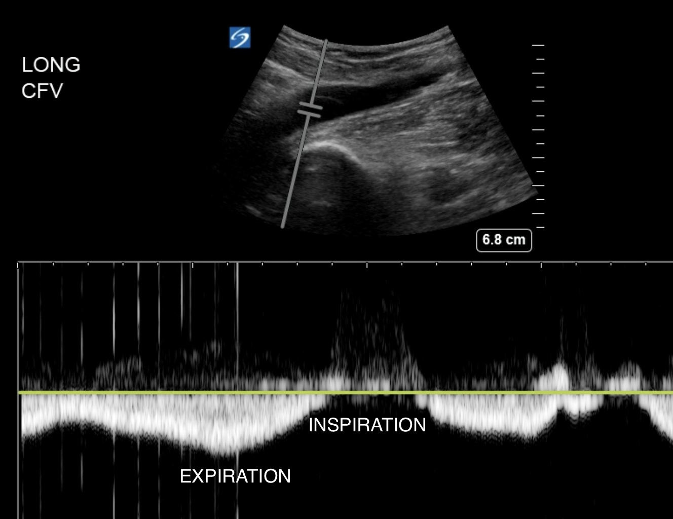 Some people also look for augmentation. This is where you image a longitudinal view of the the CFV and place the PW doppler gate in its lumen. You will see venous flow as a continuous wave
