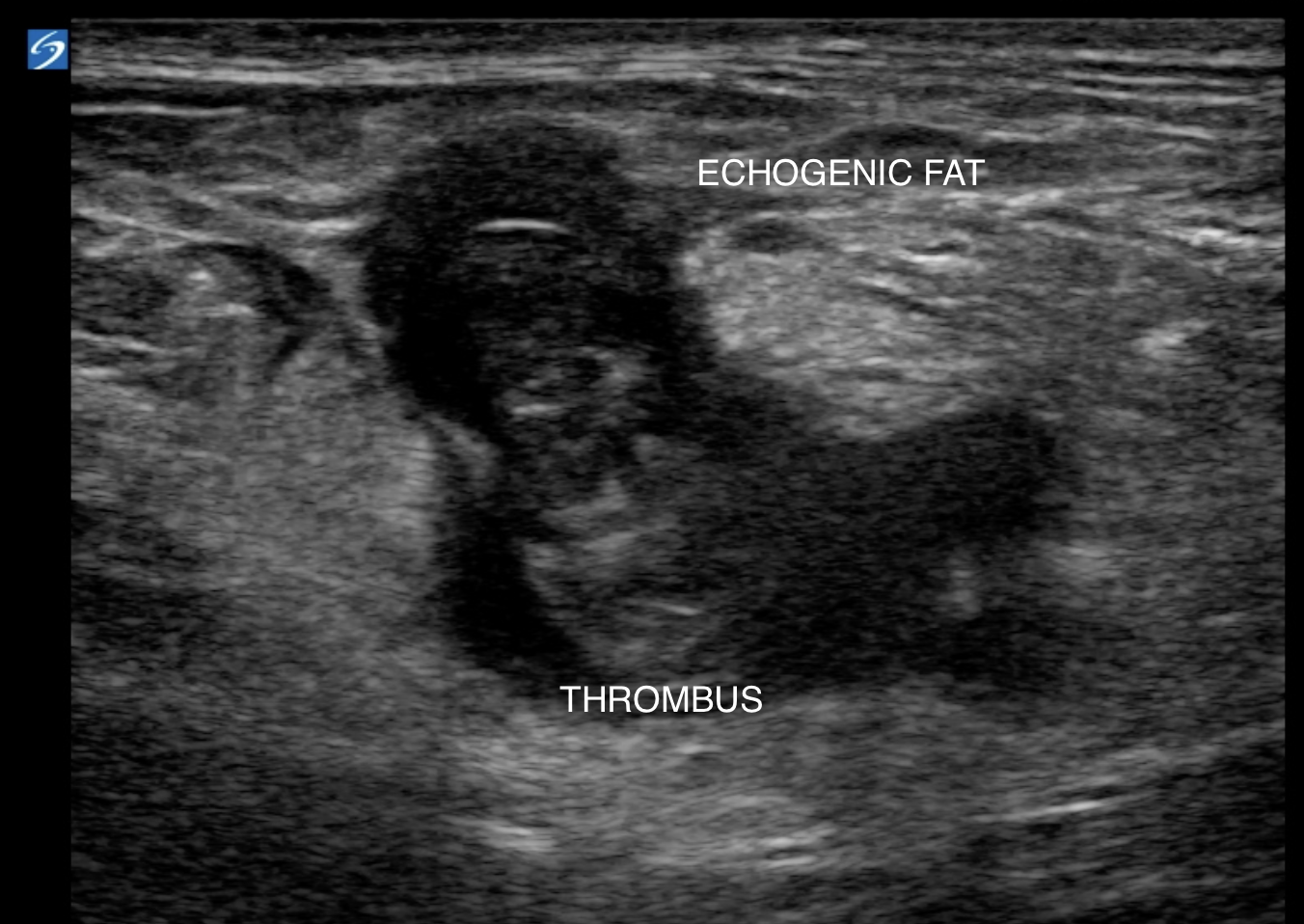 Sometimes you may also see echogenic fat surrounding the thrombosed vein due to inflammation.