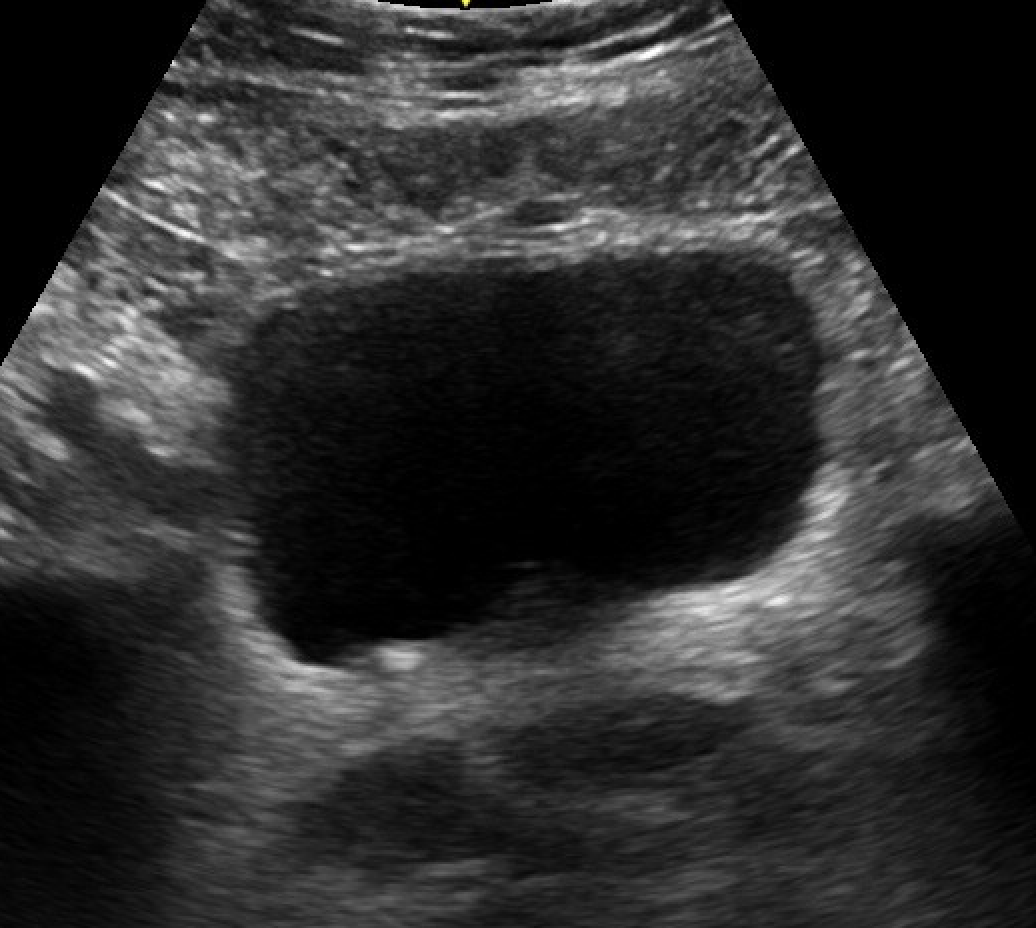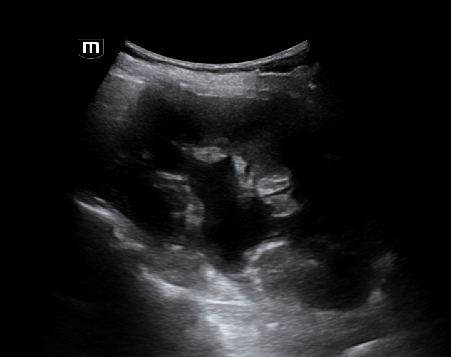 Bedside US was negative for pelvic free fluid of masses. However, renal US revealed: