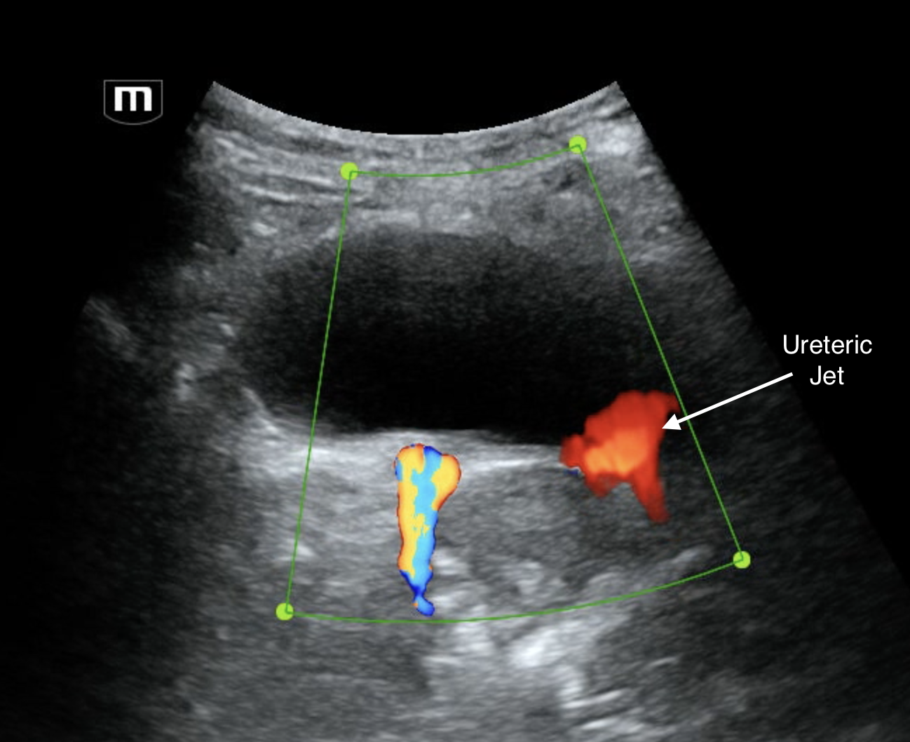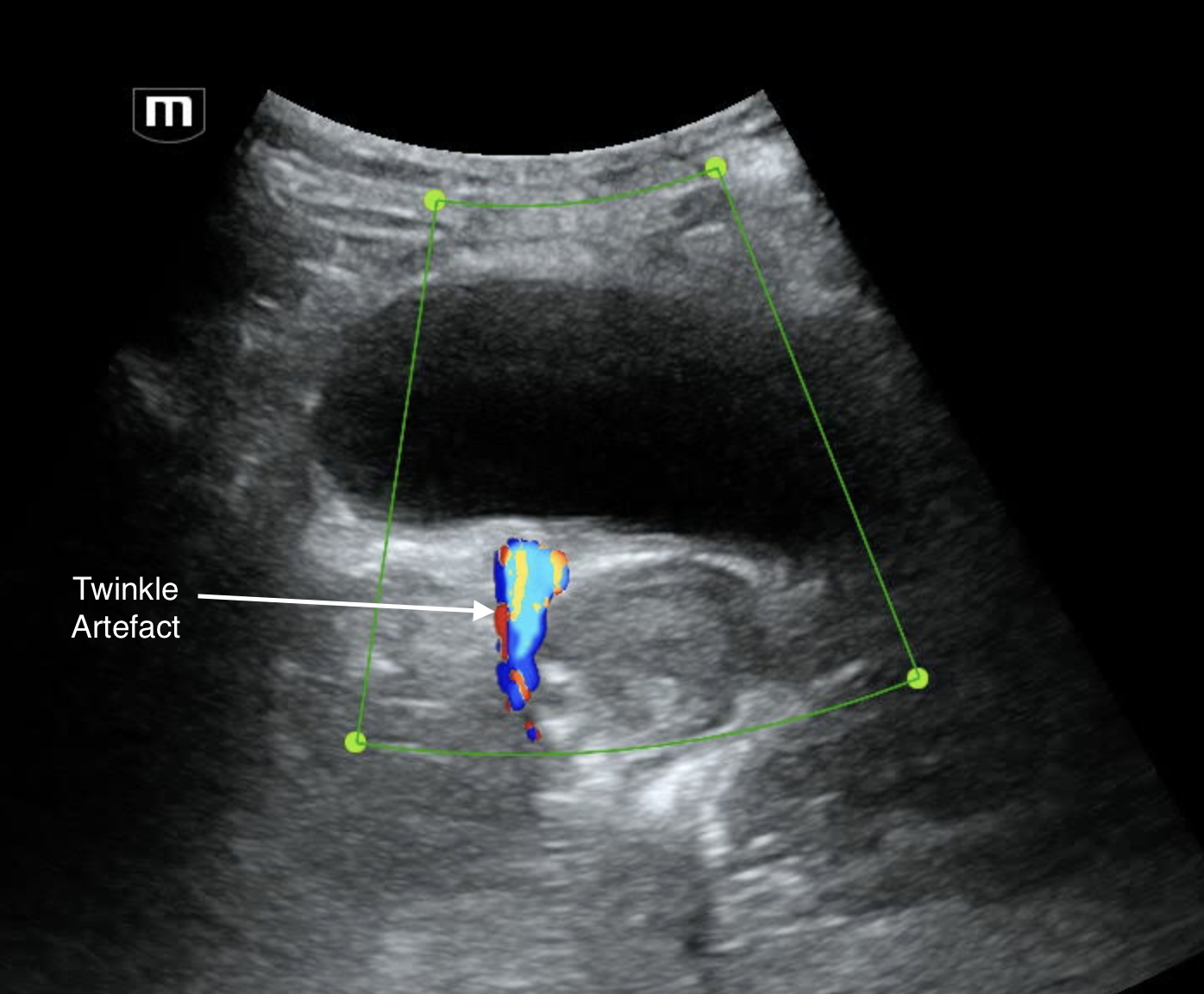 Examination of the bladder revealed a small hyperechoic linear structure at the VUJ (likely renal stone). Colour doppler on this revealed twinkle artefact which is typical for renal stones.