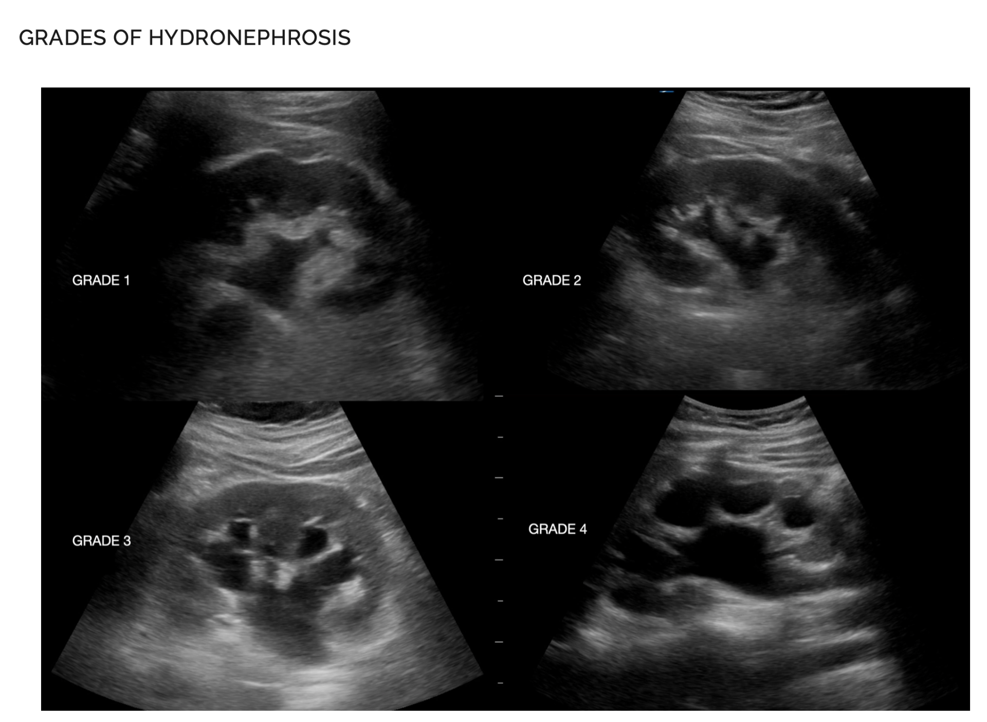 Grades of hydronephrosis: Grade 1: dilated pelvis and ureter only; Grade 2: + dilated calyces, but not clubbed; Grade 3: + clubbed cayces but normal cortical thickness >1cm; Grade 4: + thin cortex